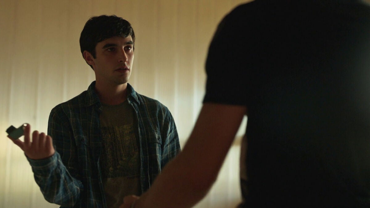 Álex está en una zona vacía del colegio a solas. Sólo le acompañan la culpa y el miedo por todo lo que está pasando. De pronto aparecen dos chicos que, en tono chulesco, le provocan. El hijo del Juez Romero saca el inhalador de su bolsillo y lo utiliza dos veces. Uno de los chavales le sigue provocando, pidiéndole un poco de la “droga”.